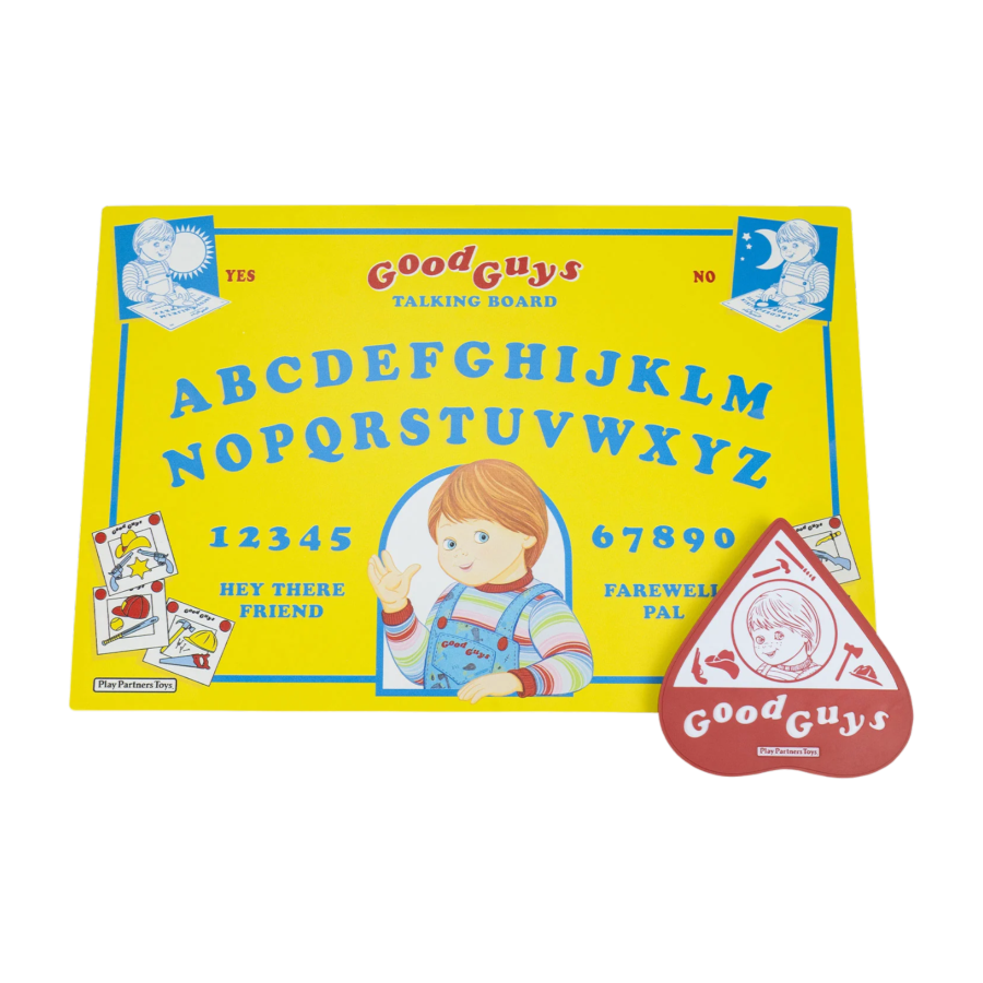 Officially licensed Good Guys Talking Board includes beautifully designed full color board and sculpted planchette. Packaged in a detailed themed box great for display!