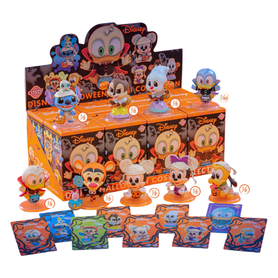 Each random package box includes an approximately 7 – 9.5cm tall Disney Halloween Cosbi Collectible and a special collection card. It comes sealed in a foil bag and is blind boxed to preserve the rarity and collectability of the series.