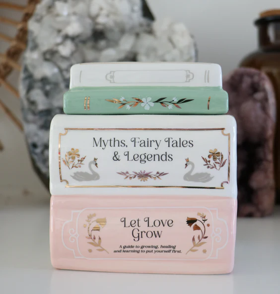 This ceramic oil burner is styled like a charming stack of beloved books, making it an ideal addition to any cosy reading corner. Designed for use with fragrance oils, it features a removable lid and a space at the back for a standard tealight.
