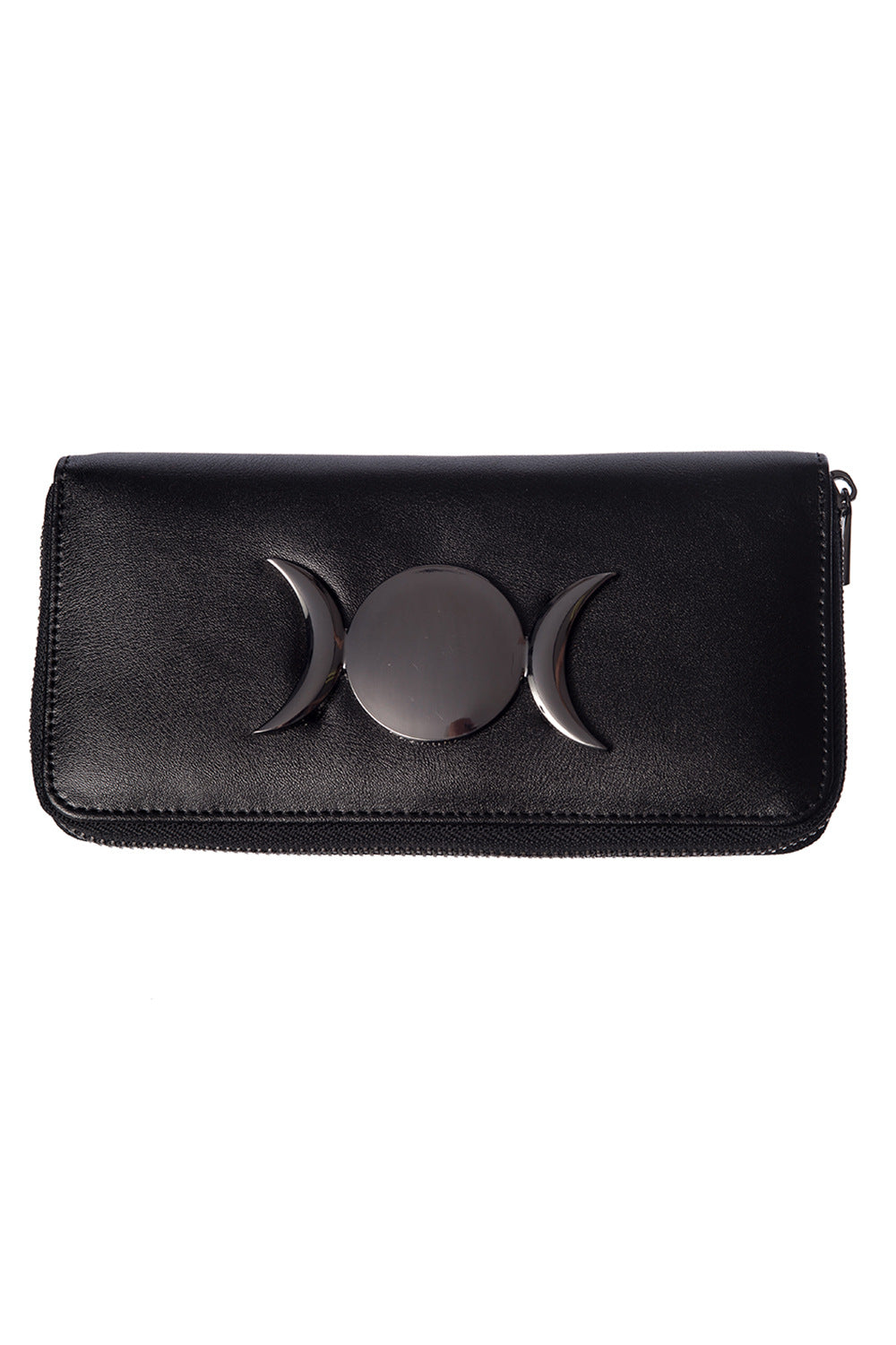 Faux leather wallet by Banned Apparel with a triple goddess symbol to the front. Featuring a zip fastening, zipped coin compartment inside with space for notes and plenty of cards on both side of it. Made of 100% PU leather. Approximate dimensions are 19 x 9.5 x 2.5 cm / 8 x 4 x 1 inches.