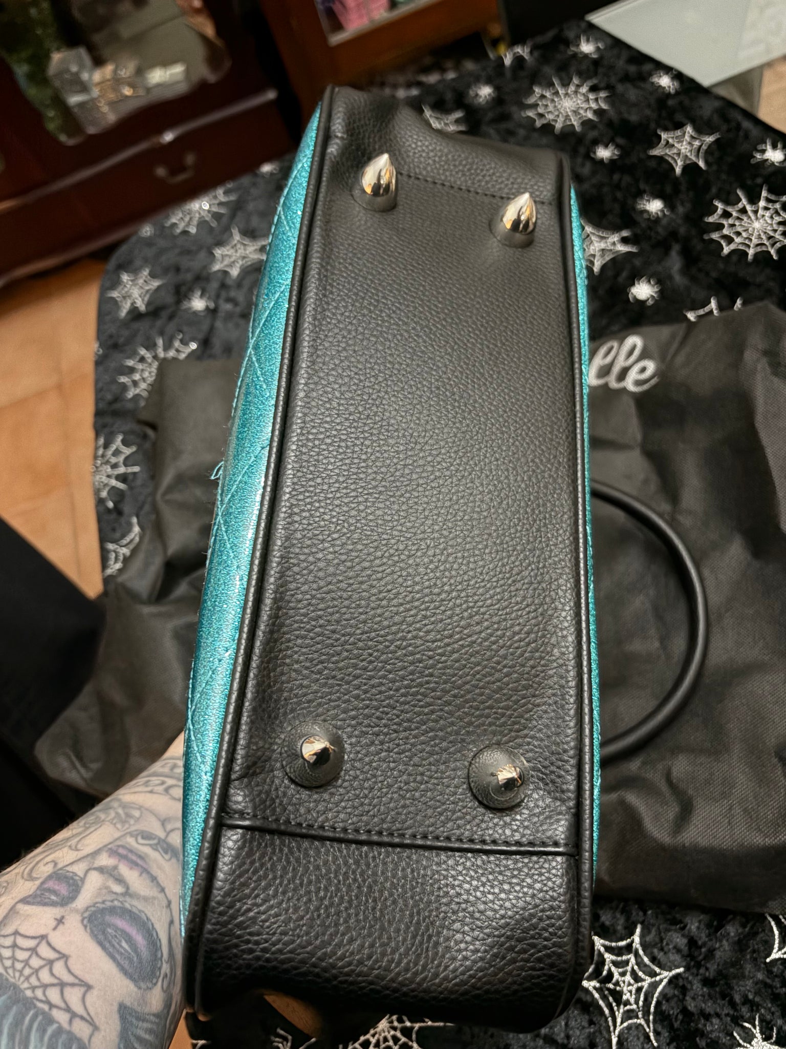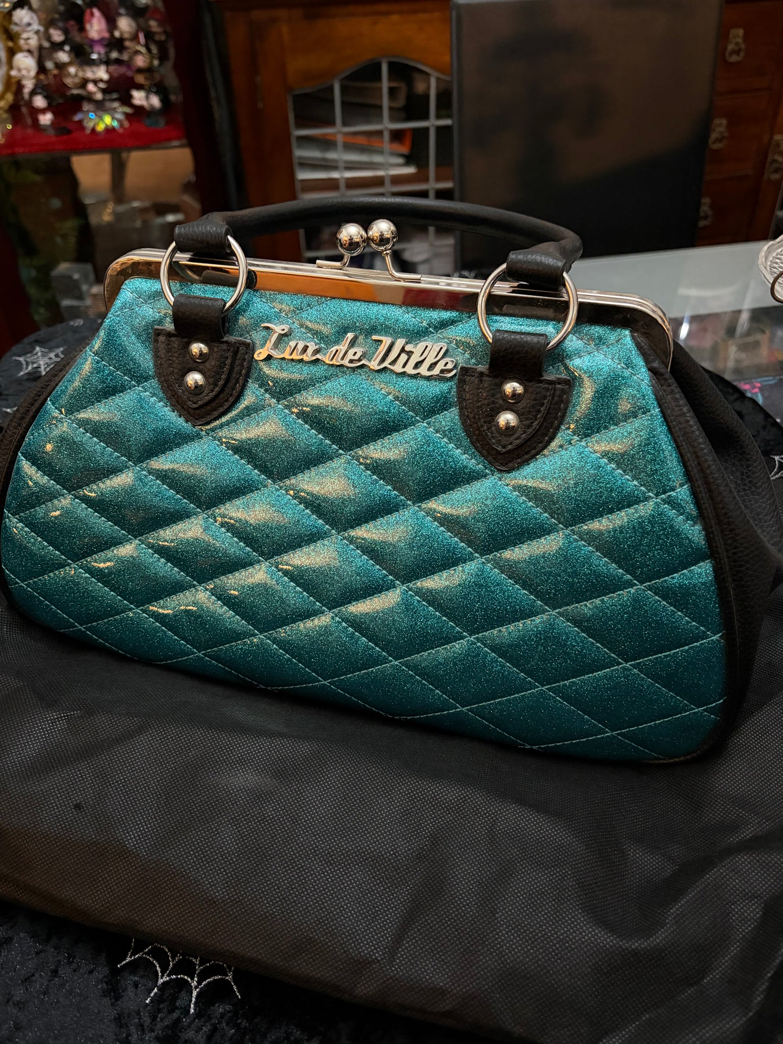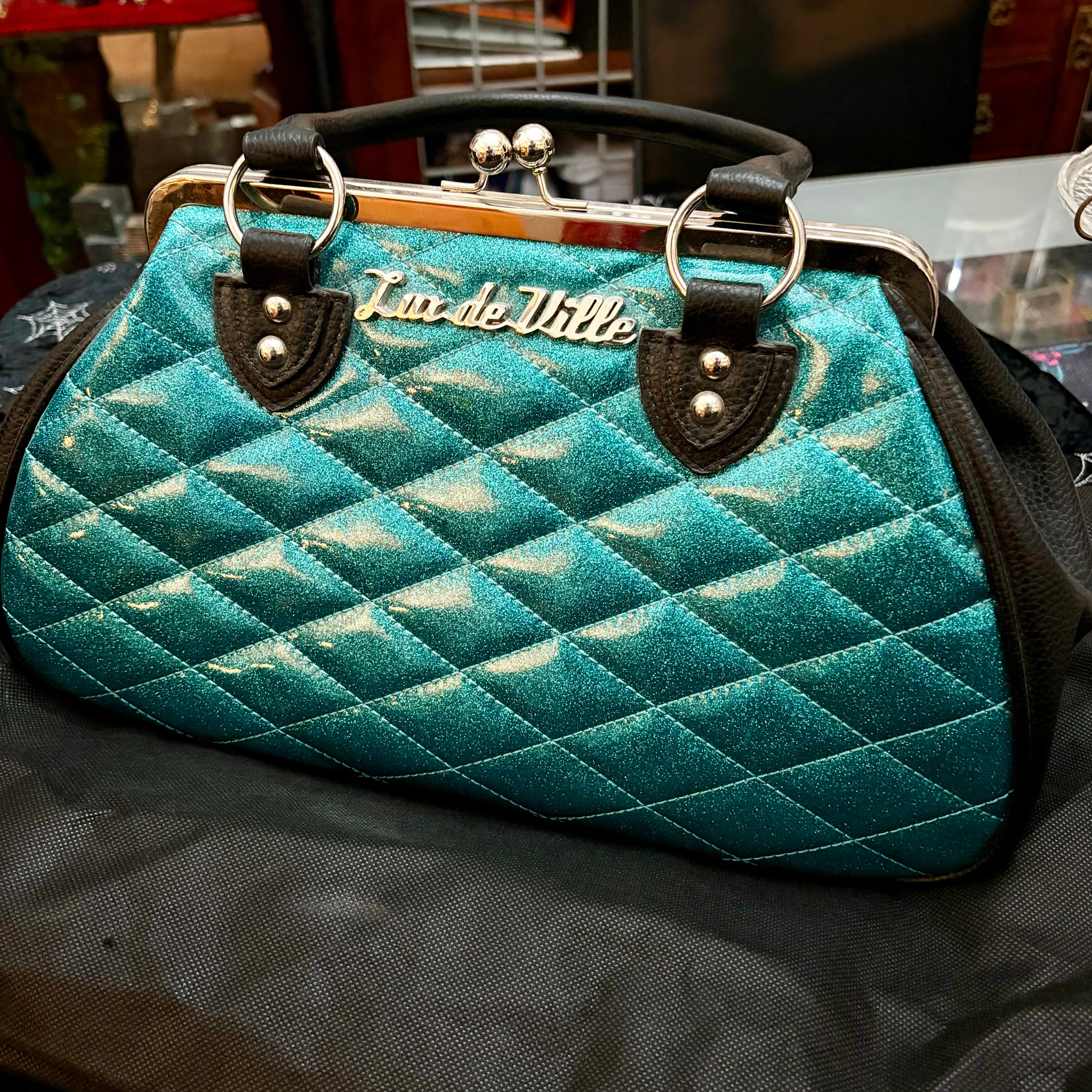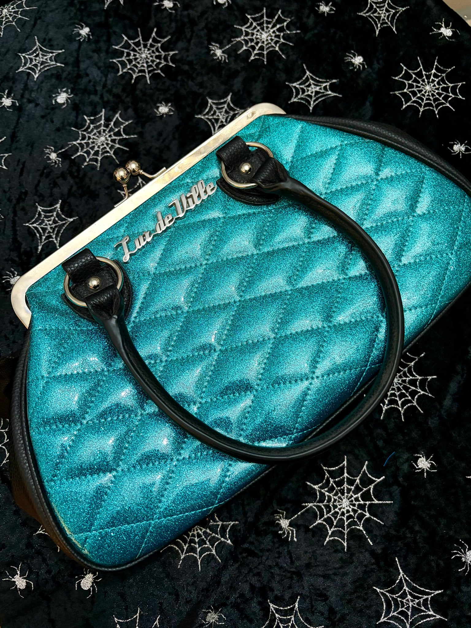 Lux DeVille Blue Vinyl Sparkled Handbag. Used once maybe twice for a short outting, is in like new condition. Comes with crossbody strap also.