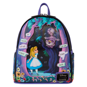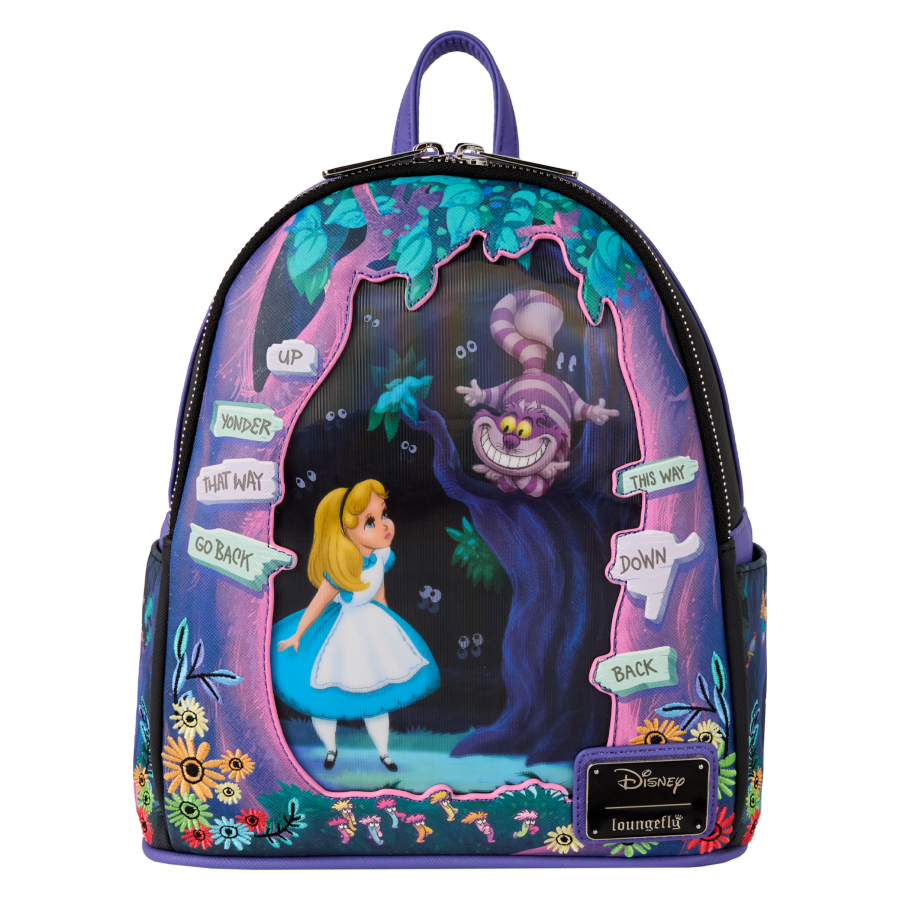 Shift the bag back and forth and the Cheshire Cat appears and disappears in a lenticular feature. Visuals of Wonderland appear around Alice on the front and across the side pockets.
